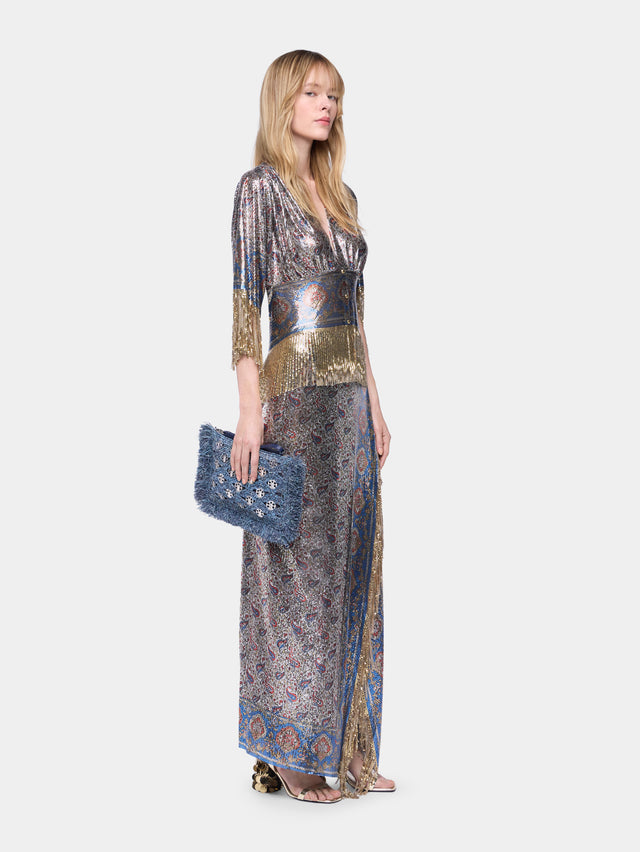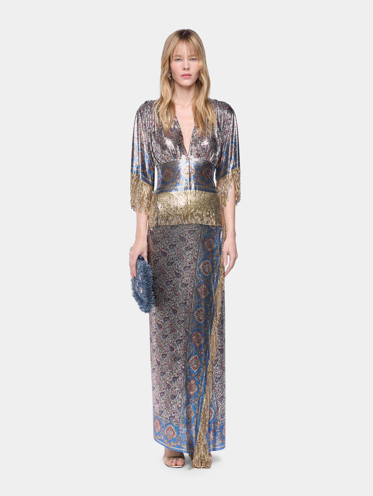 Three-quarter sleeve top in Paisley bandana print mesh with V-neck and fringe details.