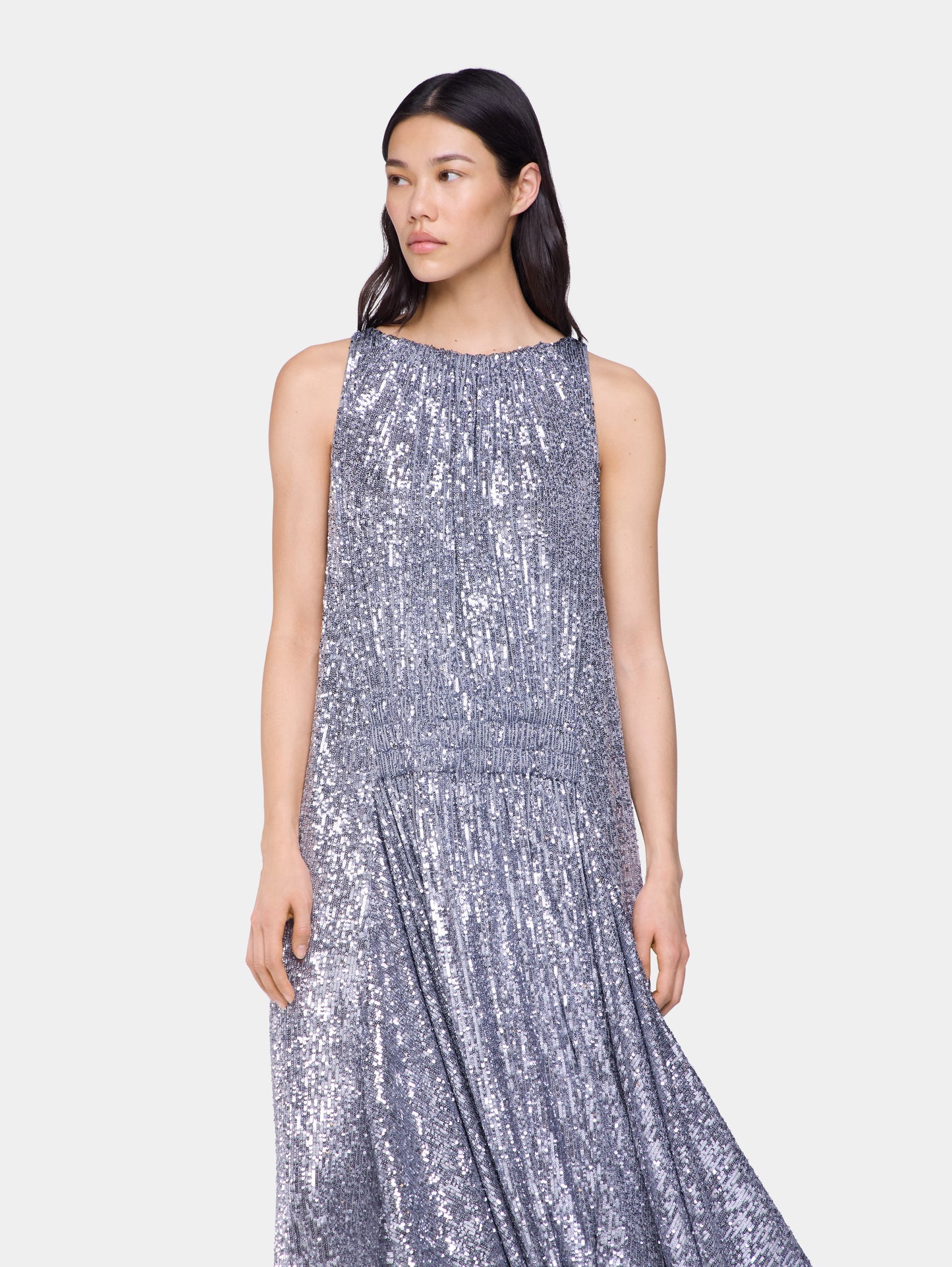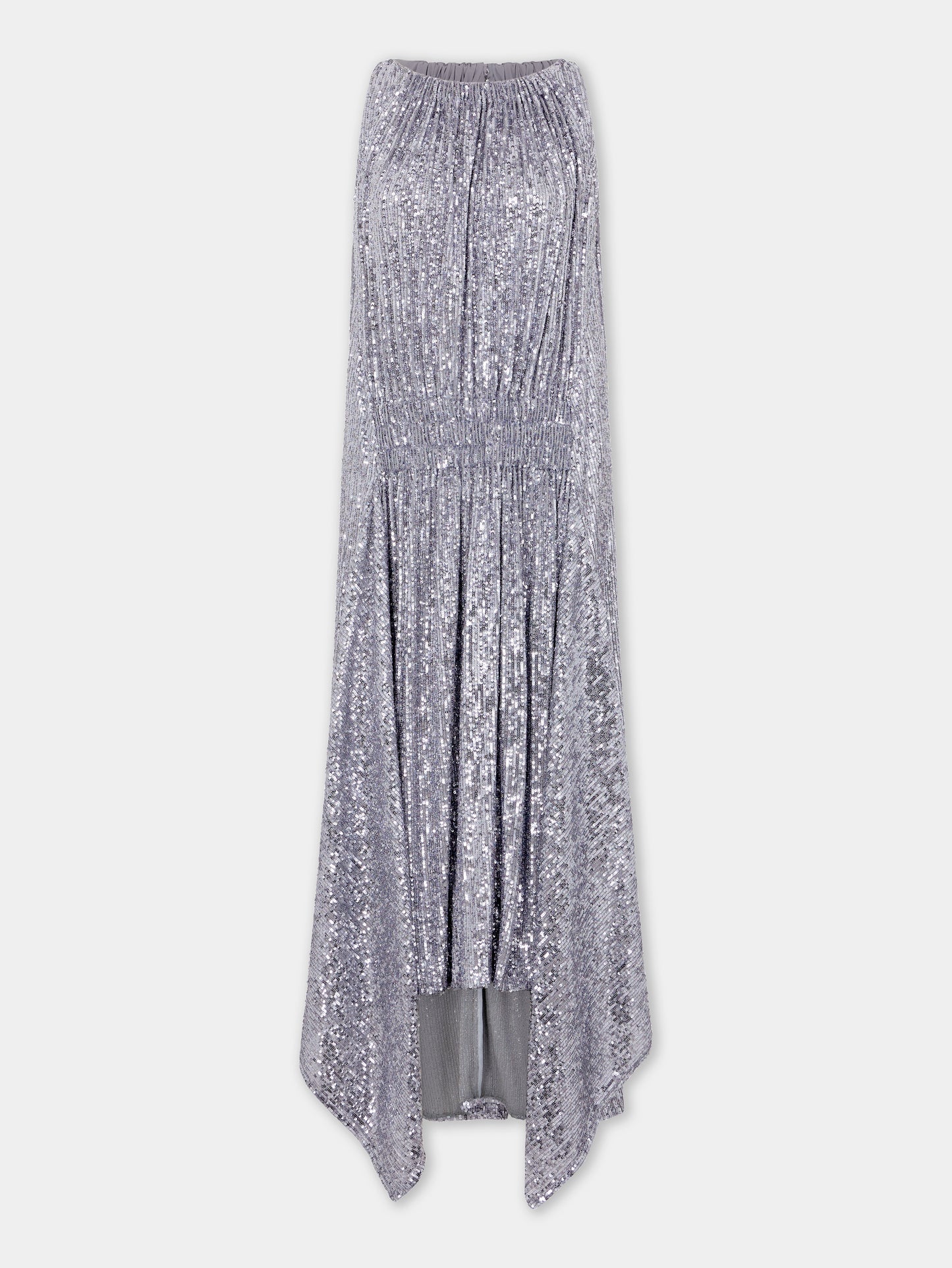 - Fabric adorned with sparkling silver sequins. Detail of a slit at the back.