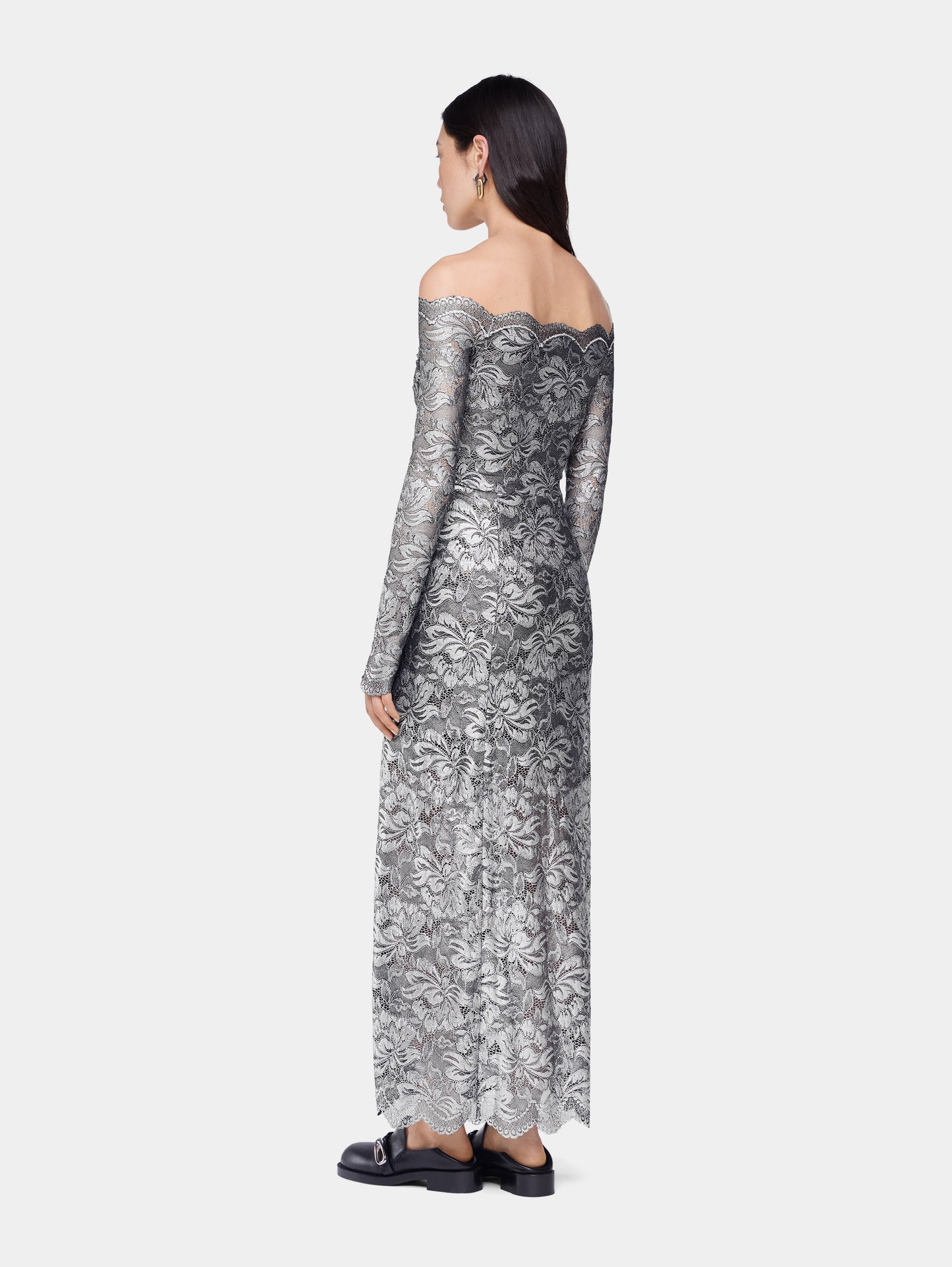 Off-shoulder long dress with long sleeves in lace with silver foil coating.