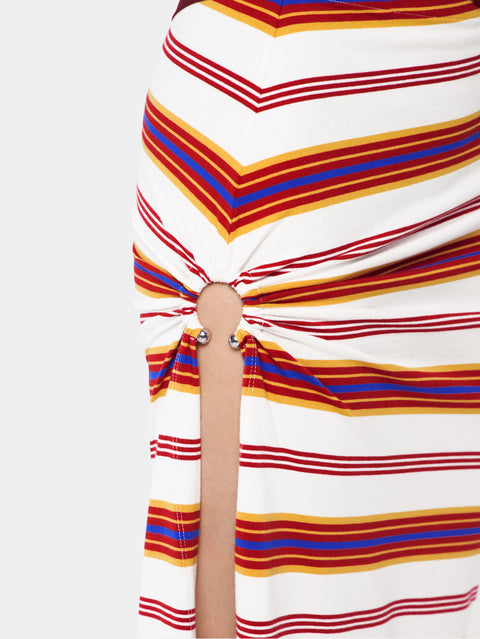 Draped long skirt in jersey featuring a multicolored striped pattern.