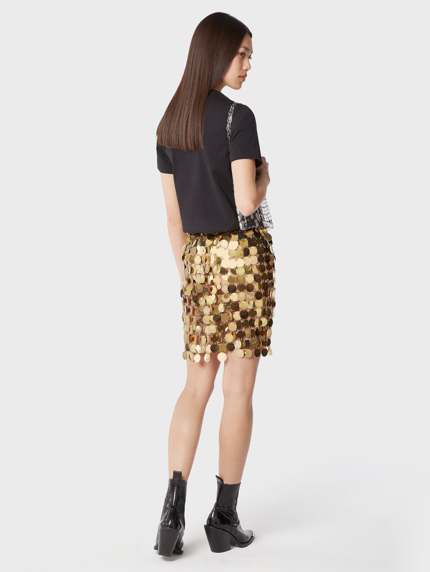 Assembled with gold sparkle discs and metallic rings, that reflect the light, this fitted skirt is an iconic piece from the Rabanne sparkles collection showcasing the Maison's savoir-faire.