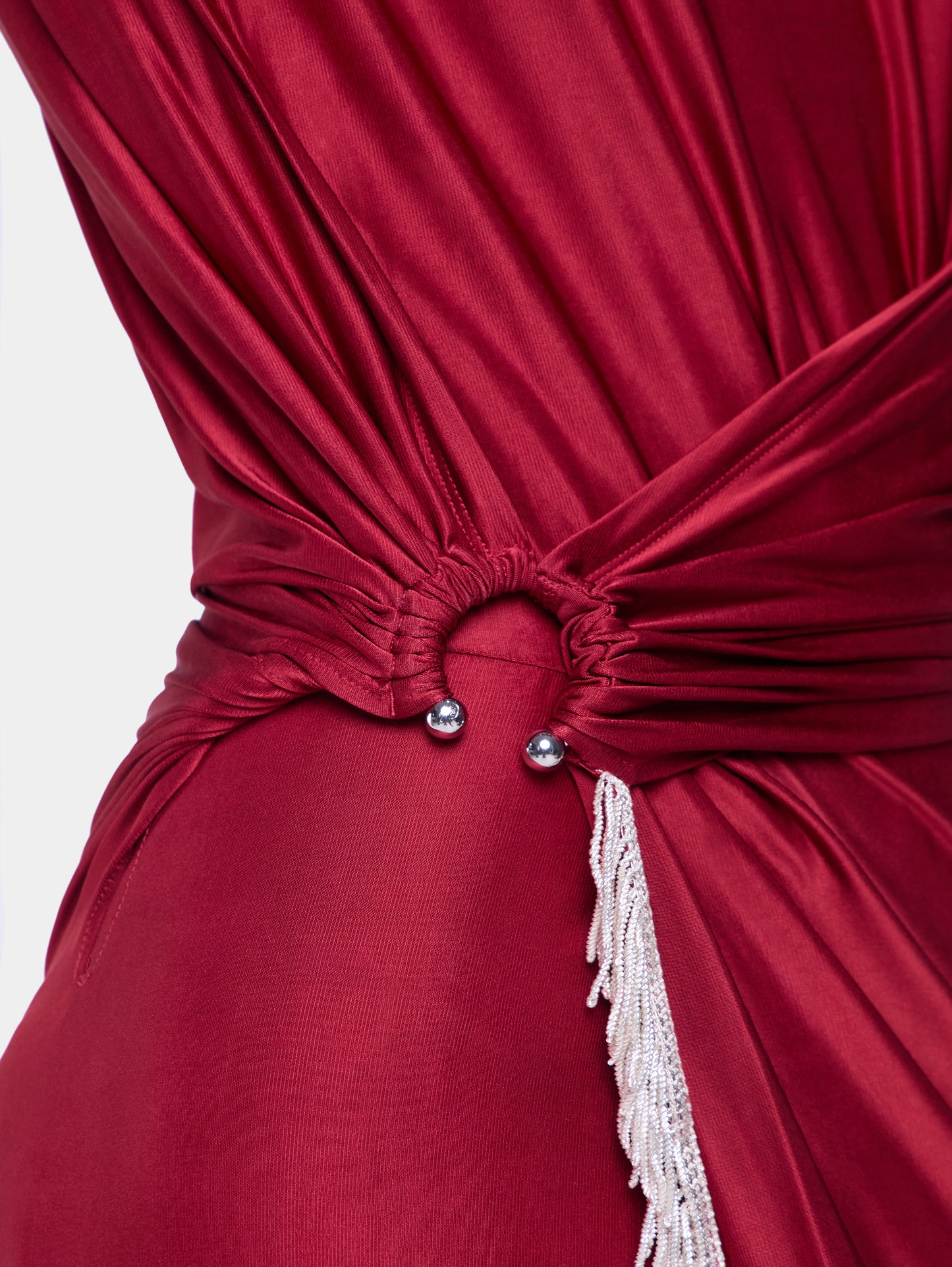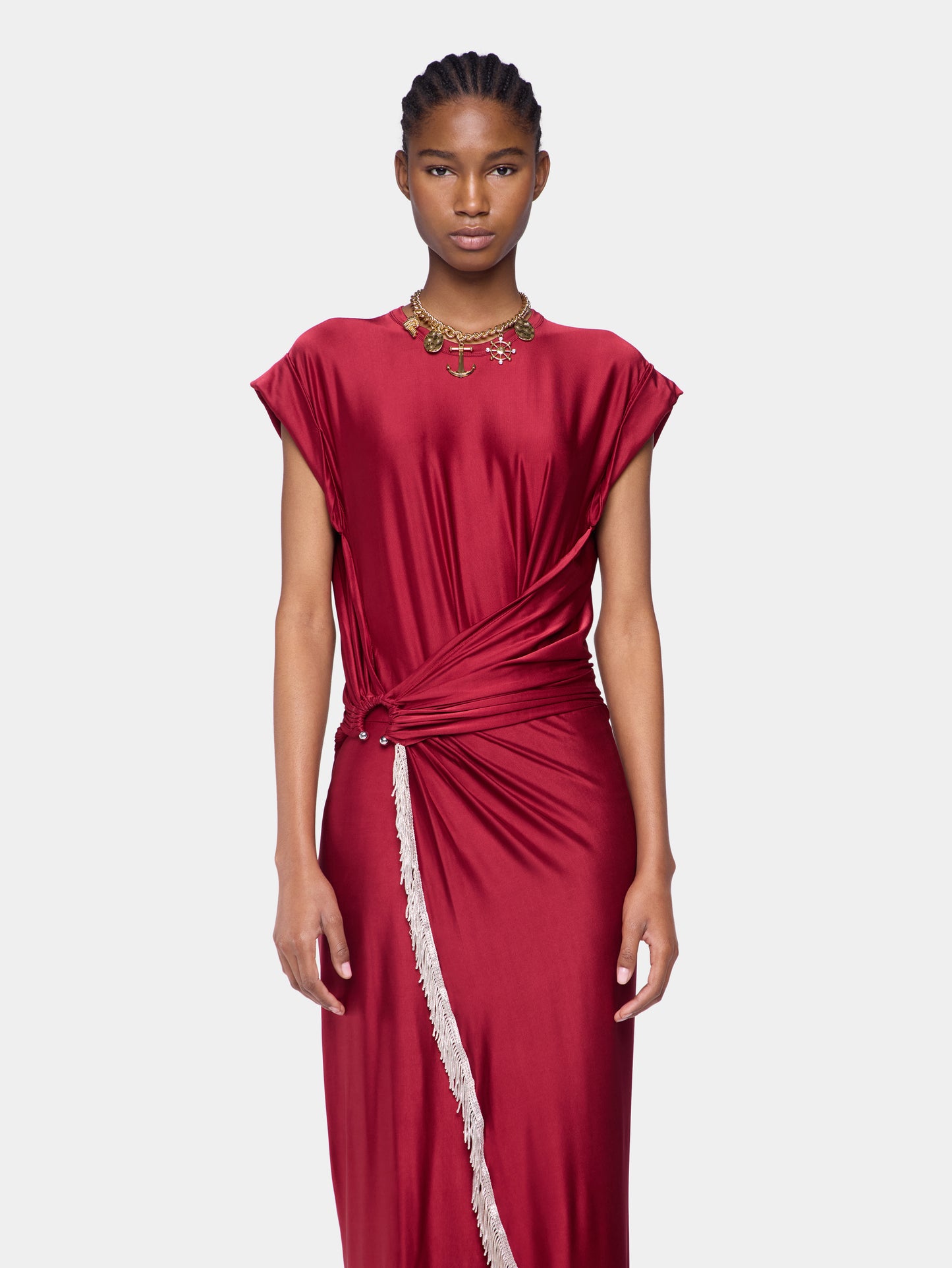 Cup-sleeve long dress with piercing detail and fringe embellishments.