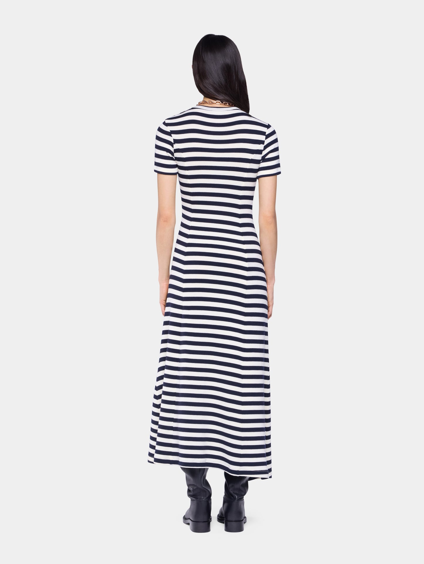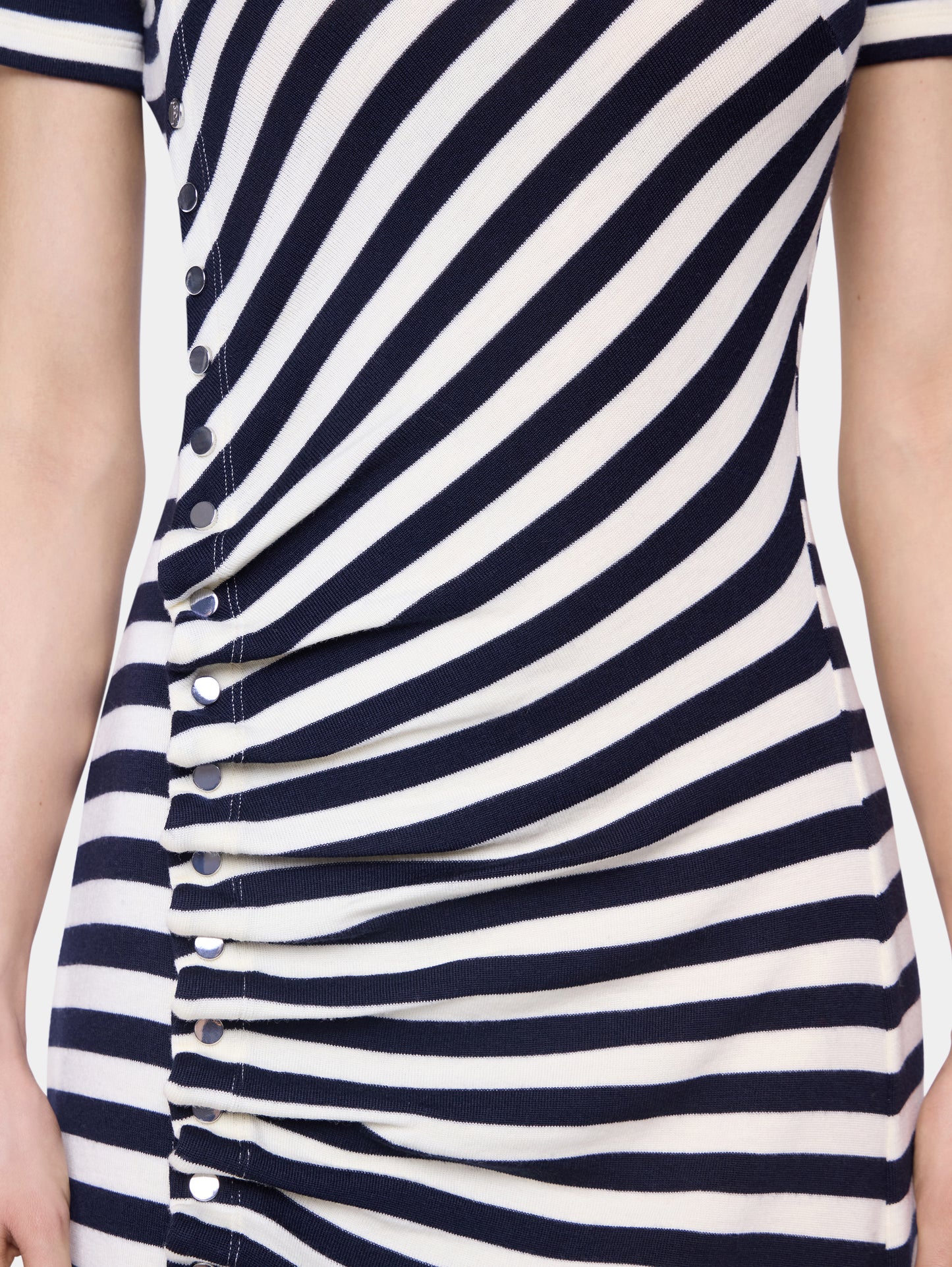 Draped midi dress with short sleeves in wool jersey and press button fastening.