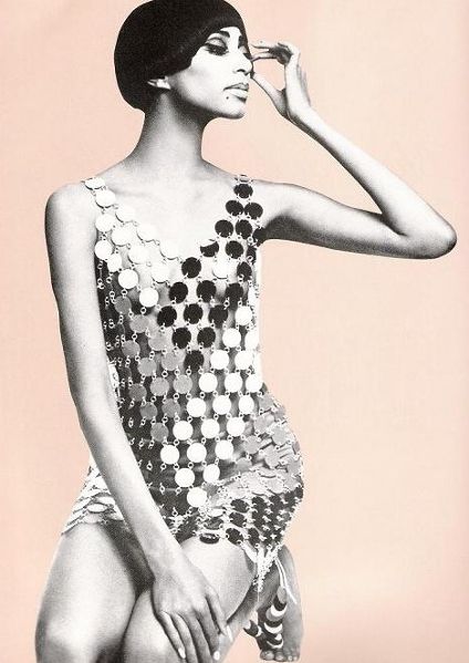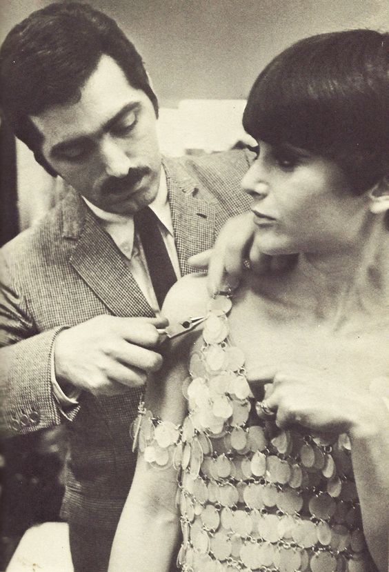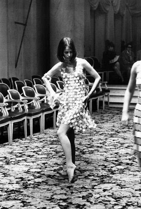 The Maison Rabanne's first show, on February 1, 1966, at the Hotel George V in Paris, was based on a founding manifesto. The collection featured models made of rhodoid lamella or disks linked by metal rings. Rabanne's signature assemblage was born.