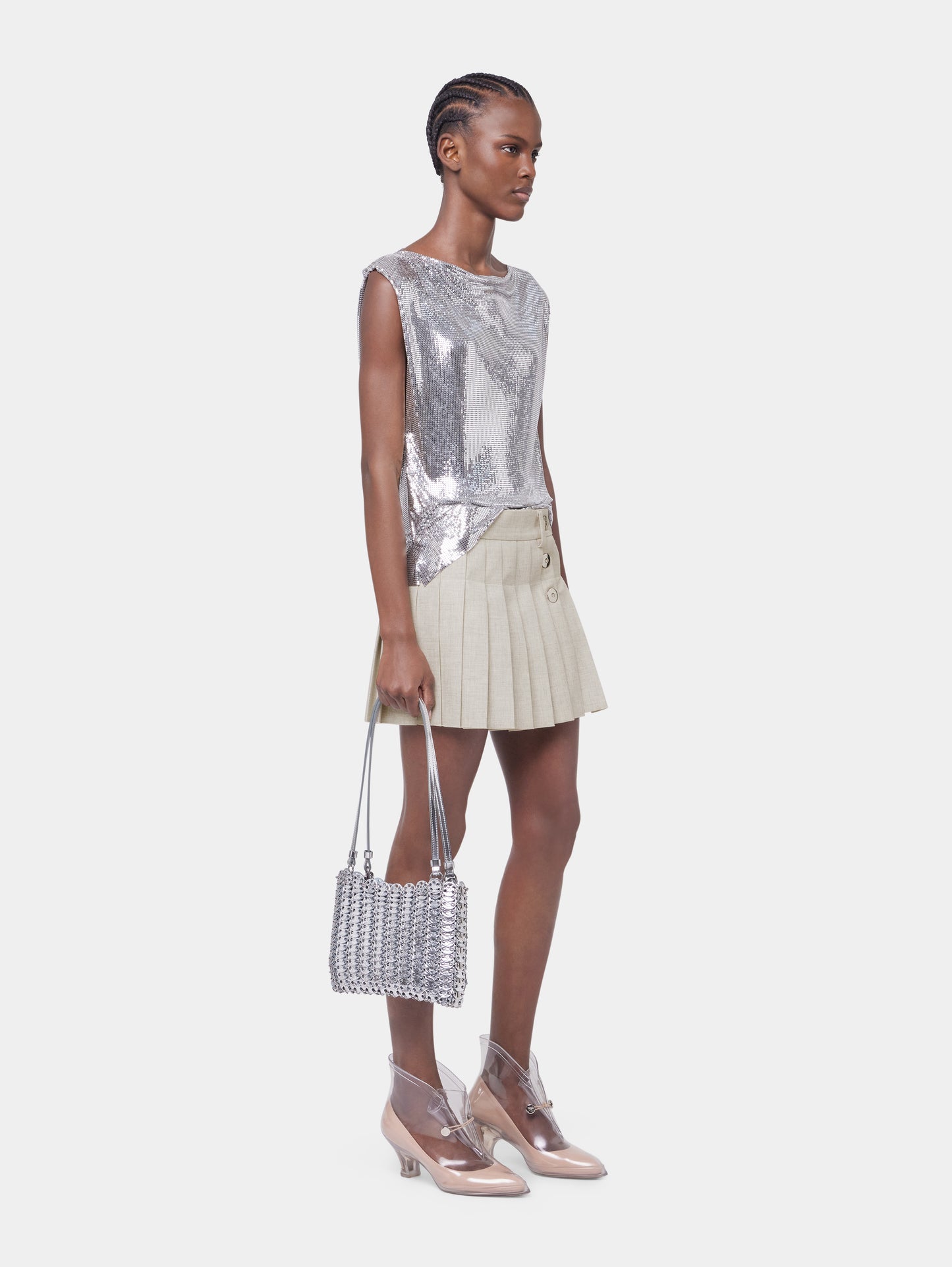 Ce haut sans manches en mesh argenté allie la simplicité de la coupe à la sophistication d'un tissu iconique de la Maison Rabanne. Ce haut argenté léger et doux est très agréable à porter.