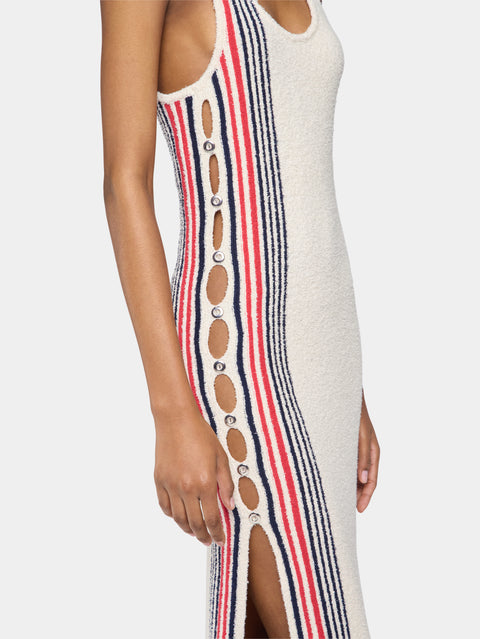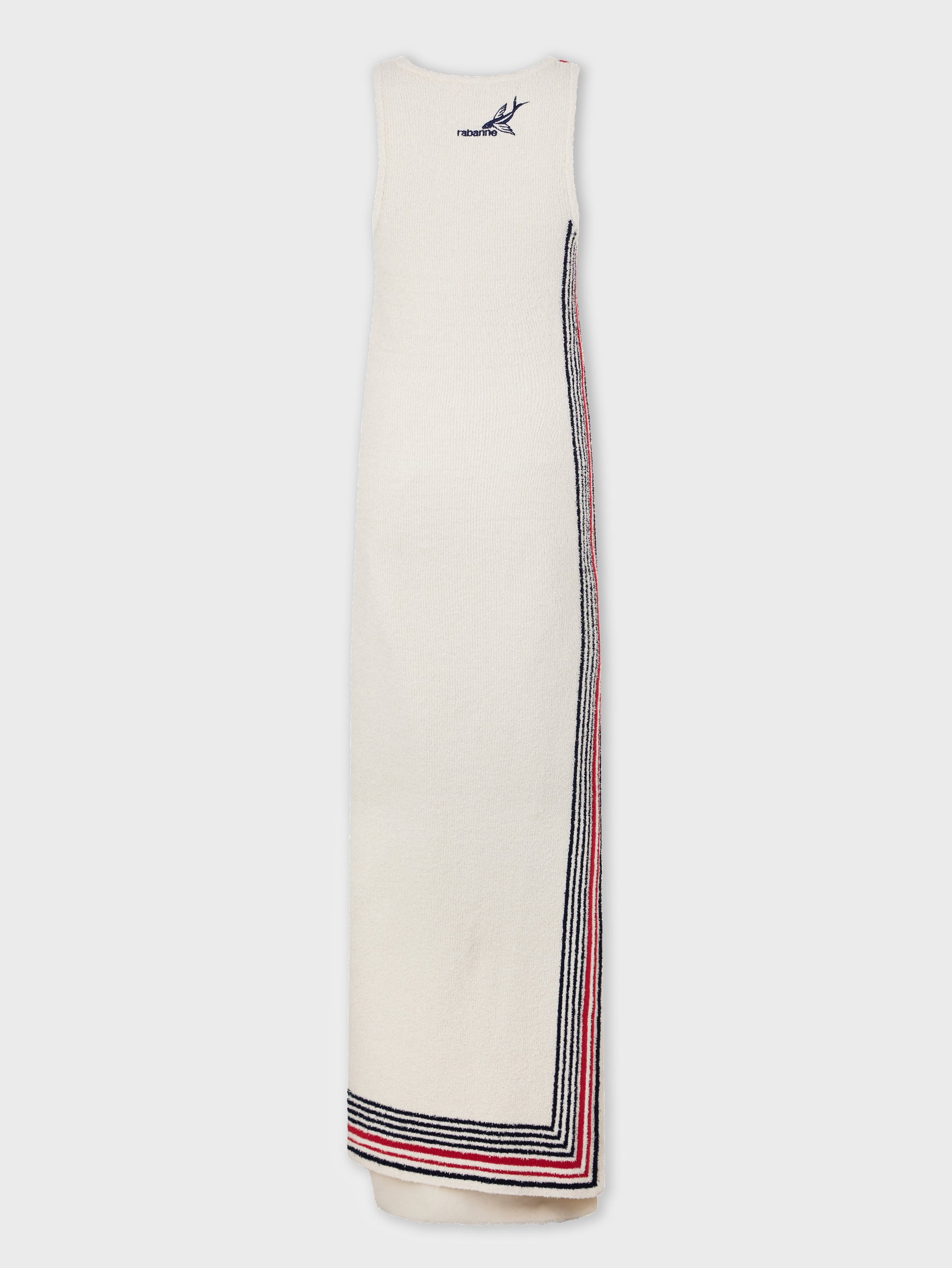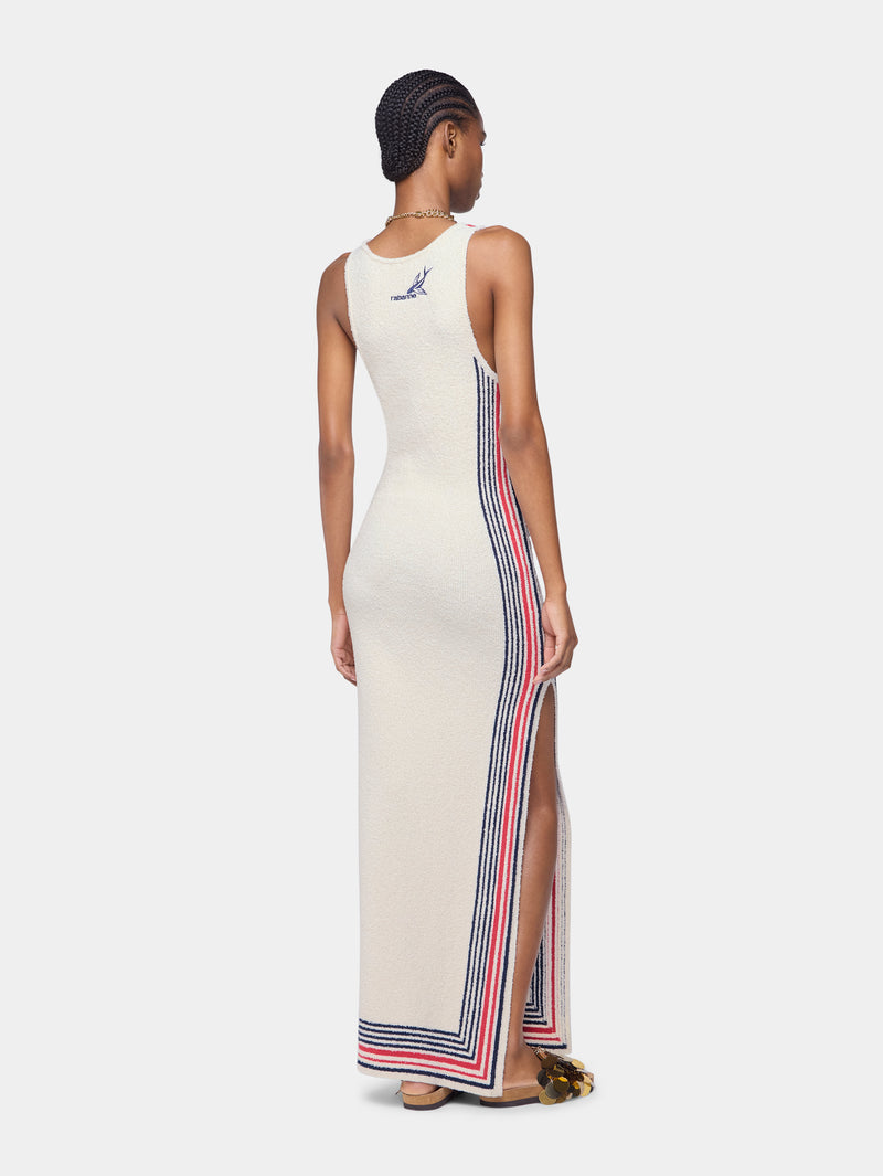 Sleeveless long dress in terry jersey with a striped pattern and slit on the right side.