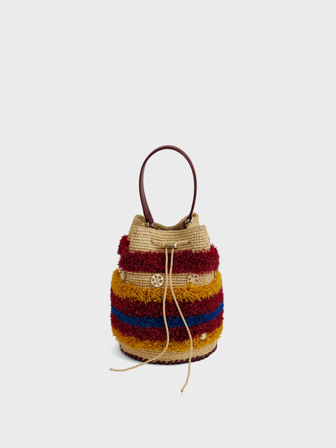 Raffia bucket bag adorned with red, orange, and blue fringes featuring a striped pattern. Details of 1969 golden discs.
